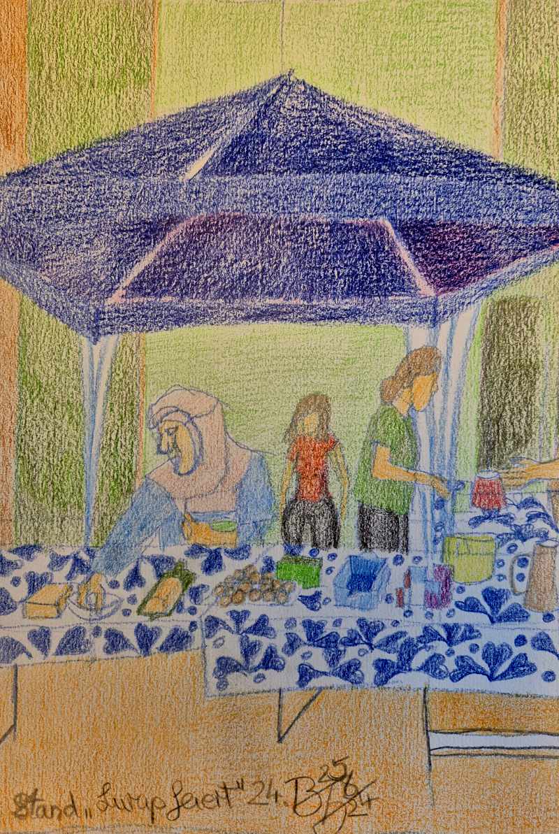 mit Werken, die im Rahmen des Projekts „Frauen lernen sich beim Malen kennen“ entstanden sind – ein offenes Angebot von Frauen im Flow im KuBi.